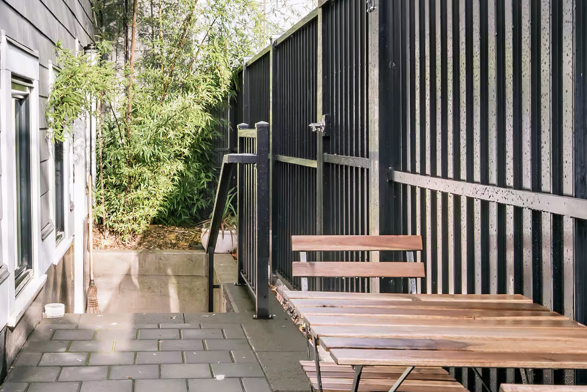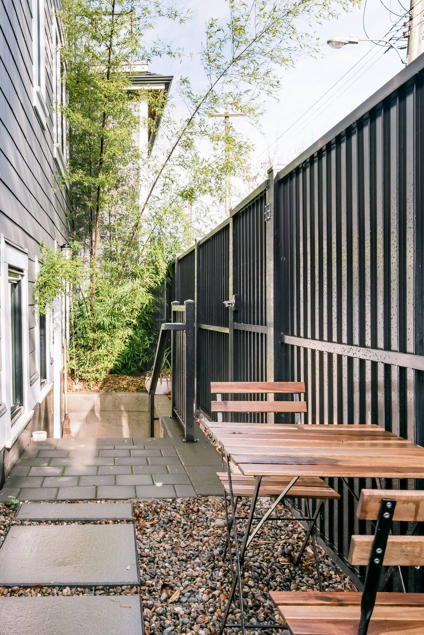 Tucked alongside the Garden Suite at Maison Q, the outdoor space offers a peaceful urban retreat framed by sleek fencing and lush bamboo greenery. The private garden path, lined with river stones and large stepping slabs, leads to a cozy café-style seating area—perfect for sipping your morning coffee or unwinding with a glass of wine in the evening. The natural landscaping brings a soft, organic touch to the modern design, creating a quiet escape just steps from your door.